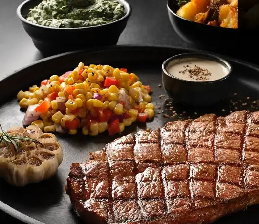 طلبت وجبتي الرئيسية “واقيو ستيك” مع صوص الفطر، واخترت معها بطاطا محمصة وروز ماري، وكانت البطاطا لذيذة جدًا. الستيك كان متوسط، ما كان بنفس المستوى اللي توقعته، لكن الأطباق الجانبية عوضت كثير. جربت كمان من المقبلات روليت شريمب وتشيكن ستربس، وكانت مقرمشة وطعمها ممتاز، بس بعض الأطباق وصلت باردة شوي. سلطتهم المفتوحة ممتازة، فيها تنوع ونظافة، ومناسبة جدًا لعشاق الأكل الخفيف.